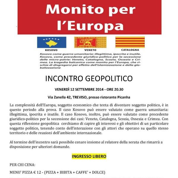 DettagliSERATA INFORMATIVA: “KOSOVO.. MONITO PER L’EUROPA” relatore Giorgio Gai Venerdì 12 Settembre ore 20:30 presso Pizzeria Ristorante “Picanha” Via Zanella 42 Treviso (quartiere Selvana) Incontro di approfondimento sullo sviluppo delle autonomie locali in europa ospite della serata è l’autore Giorgio Da Gai Il tema della serata è tratto dal suo libro “Kosovo, Monito per l’Europa”…