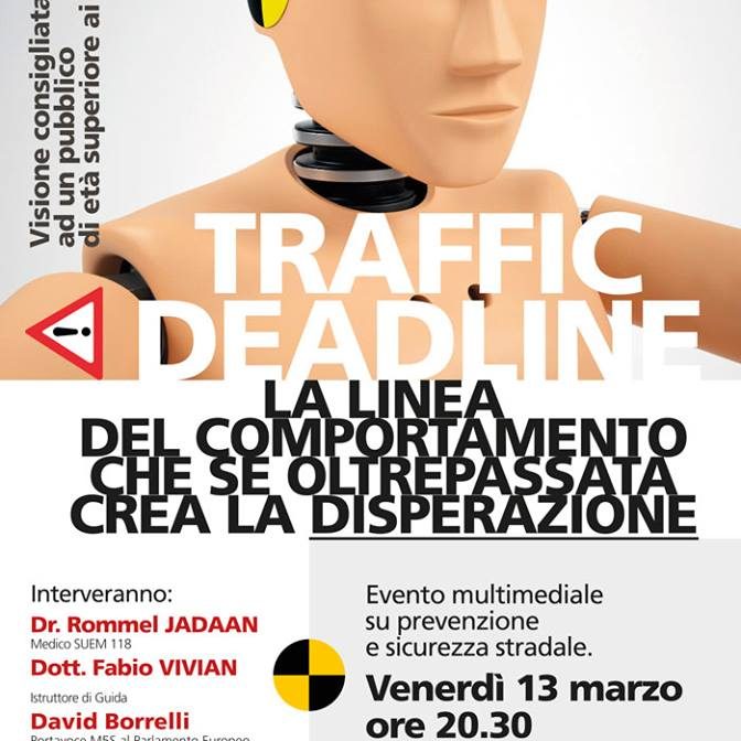DettagliTraffic Deadline – La linea del comportamento che se oltrepassata crea la disperazione Evento multimediale su prevenzione e sicurezza stradale Venerdì 13 Marzo, ore 20:30 – BHR Hotel – Quinto di Treviso Interverranno: Dr. Rommel Jadaan – Medico SUEM 118 Dott. Fabio Vivian – Istruttore di guida David Borrelli – Portavoce M5S al Parlamento Europeo,…